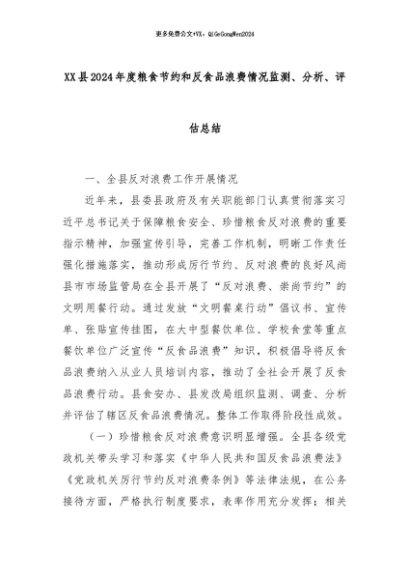 【七哥公文】2024年:XX县2024年度粮食节约和反食品浪费情况监测、分析、评估总结+更多免费公文+VX:QiGeGongWen2024