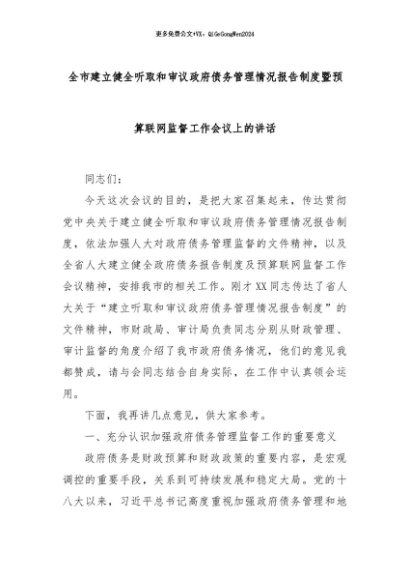 【七哥公文】2024年:全市建立健全听取和审议政府债务管理情况报告制度暨预算联网监督工作会议上的讲话+更多免费公文+VX:QiGeGongWen2024