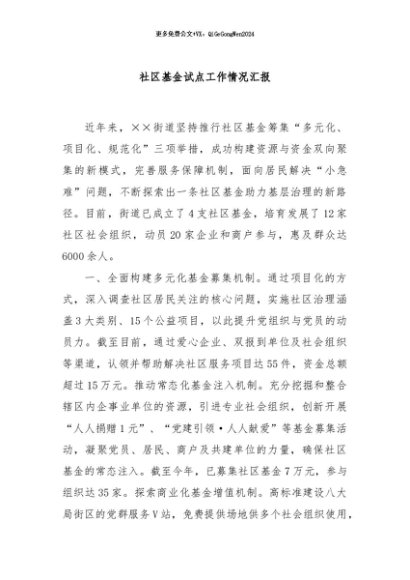 / 【七哥公文】2024年:社区基金试点工作情况汇报+更多免费公文+VX:QiGeGongWen2024