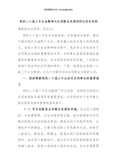 【七哥公文】2024年:党的二十届三中全会精神与水利事业发展的研讨发言材料+更多免费公文+VX:QiGeGongWen2024