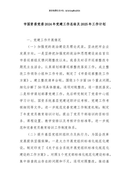 【七哥公文】2024年:市国资委党委2024年党建工作总结及2025年工作计划+更多免费公文+VX:QiGeGongWen2024