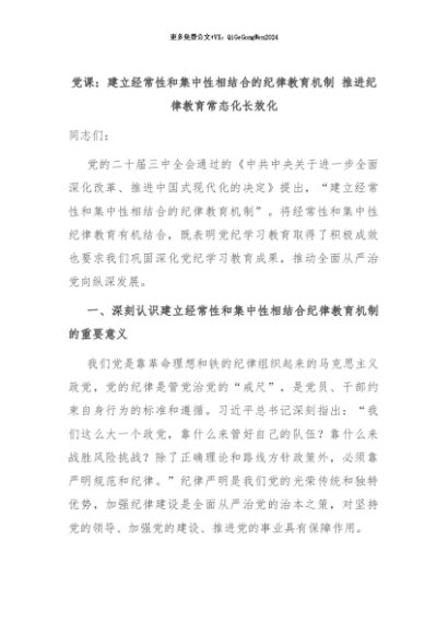 【七哥公文】2024年:党课:建立经常性和集中性相结合的纪律教育机制 推进纪律教育常态化长效化+更多免费公文+VX:QiGeGongWen2024