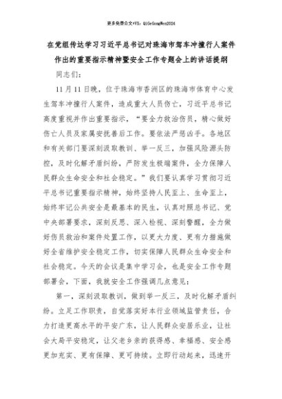 【七哥公文】2024年:在党组传达学习习近平总书记对珠海市驾车冲撞行人案件作出的重要指示精神暨安全工作专题会上的讲话提纲+更多免费公文+VX:QiGeGongWen2024