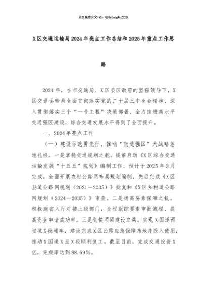 【七哥公文】2024年:X区交通运输局2024年亮点工作总结和2025年重点工作思路+更多免费公文+VX:QiGeGongWen2024