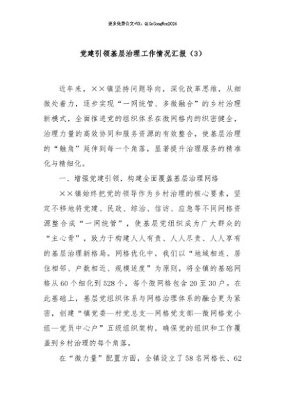 / 【七哥公文】2024年:党建引领基层治理工作情况汇报(3)+更多免费公文+VX:QiGeGongWen2024