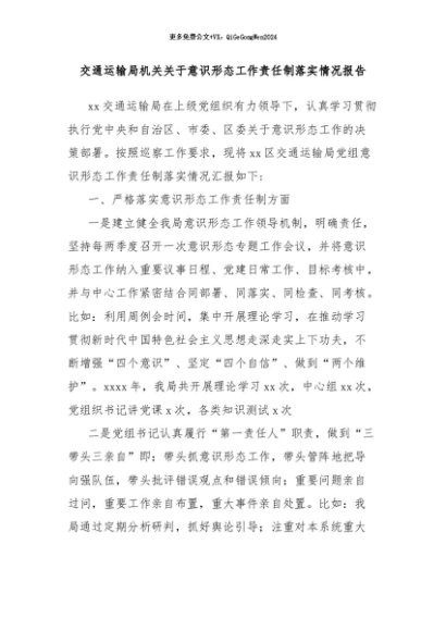 / 【七哥公文】2024年:交通运输局机关关于意识形态工作责任制落实情况报告+更多免费公文+VX:QiGeGongWen2024