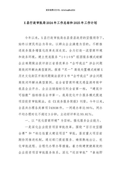 【七哥公文】2024年:X县行政审批局2024年工作总结和2025年工作计划+更多免费公文+VX:QiGeGongWen2024