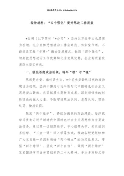 【七哥公文】2024年:经验材料:“四个强化”提升思政工作质效+更多免费公文+VX:QiGeGongWen2024