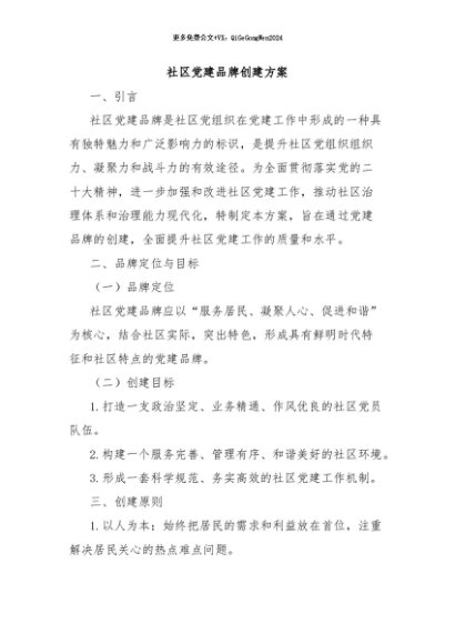 / 【七哥公文】2024年:社区党建品牌创建方案+更多免费公文+VX:QiGeGongWen2024