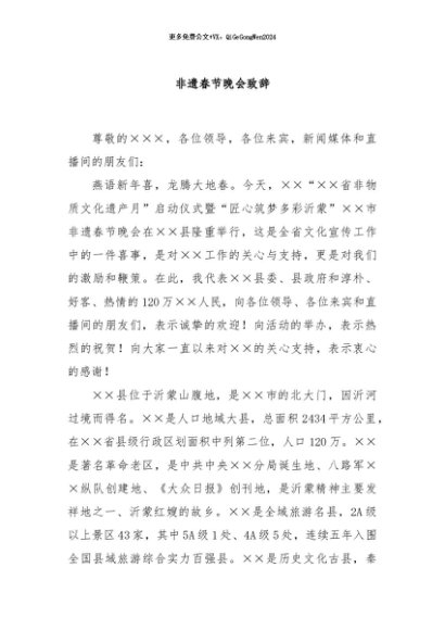 / 【七哥公文】2024年:非遗春节晚会致辞+更多免费公文+VX:QiGeGongWen2024