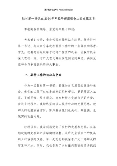 【七哥公文】2024年:驻村第一书记在2024年年轻干部座谈会上的交流发言+更多免费公文+VX:QiGeGongWen2024