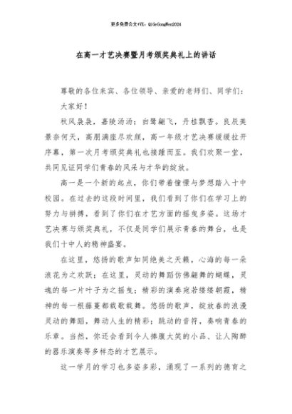 / 【七哥公文】2024年:在高一才艺决赛暨月考颁奖典礼上的讲话+更多免费公文+VX:QiGeGongWen2024