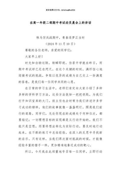 / 【七哥公文】2024年:在高一年级二部期中考试动员晨会上的讲话+更多免费公文+VX:QiGeGongWen2024