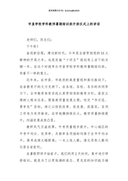 / 【七哥公文】2024年:市直学校学科教师暑期培训班开班仪式上的讲话+更多免费公文+VX:QiGeGongWen2024