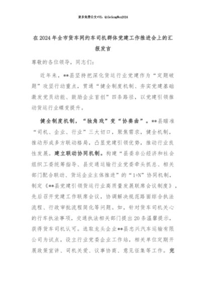 【七哥公文】2024年:在2024年全市货车网约车司机群体党建工作推进会上的汇报发言+更多免费公文+VX:QiGeGongWen2024