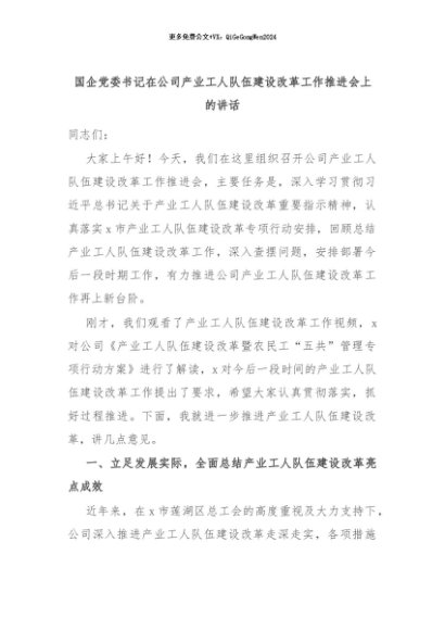 【七哥公文】2024年:国企党委书记在公司产业工人队伍建设改革工作推进会上的讲话+更多免费公文+VX:QiGeGongWen2024