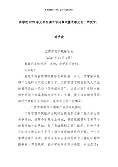 【七哥公文】2024年:在学校2024年大学生读书节闭幕式暨表彰大会上的发言: 感受爱+更多免费公文+VX:QiGeGongWen2024