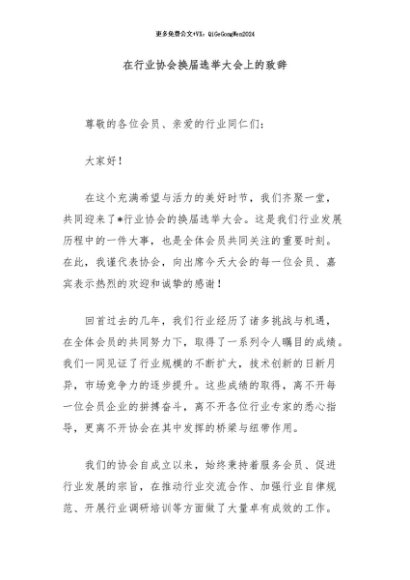 / 【七哥公文】2024年:在行业协会换届选举大会上的致辞+更多免费公文+VX:QiGeGongWen2024