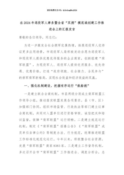 【七哥公文】2024年:在2024年退役军人事务暨全省“双拥”模范城创建工作推进会上的汇报发言+更多免费公文+VX:QiGeGongWen2024