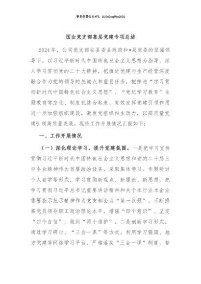 / 【七哥公文】2024年:国企党支部基层党建专项总结+更多免费公文+VX:QiGeGongWen2024