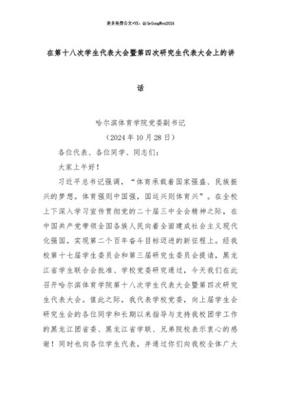 【七哥公文】2024年:在第十八次学生代表大会暨第四次研究生代表大会上的讲话+更多免费公文+VX:QiGeGongWen2024