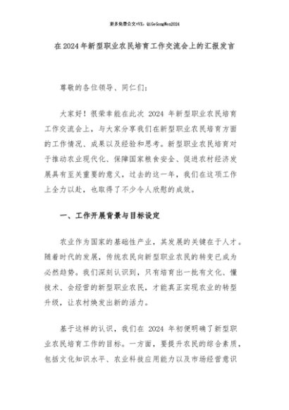 【七哥公文】2024年:在2024年新型职业农民培育工作交流会上的汇报发言+更多免费公文+VX:QiGeGongWen2024