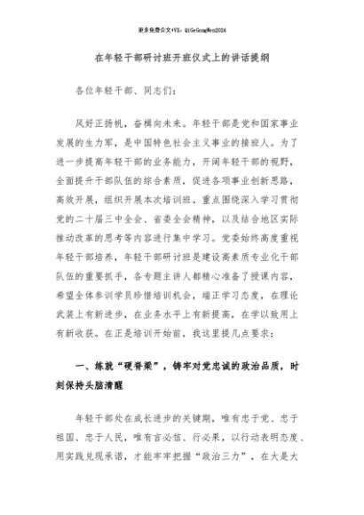 / 【七哥公文】2024年:在年轻干部研讨班开班仪式上的讲话提纲+更多免费公文+VX:QiGeGongWen2024