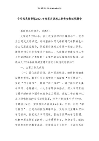 【七哥公文】2024年:公司党支部书记2024年度落实党建工作责任制述职报告+更多免费公文+VX:QiGeGongWen2024