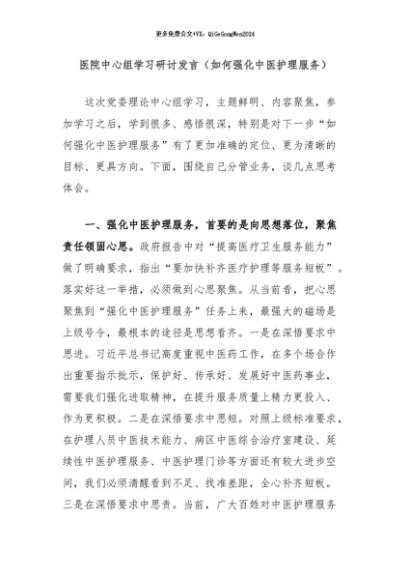/ 【七哥公文】2024年:医院中心组学习研讨发言(如何强化中医护理服务)+更多免费公文+VX:QiGeGongWen2024