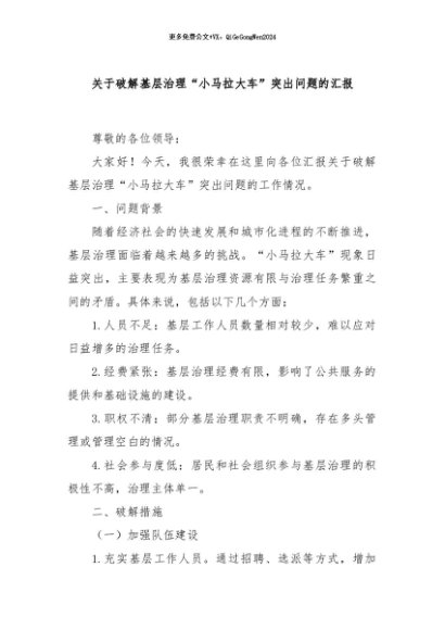 / 【七哥公文】2024年:关于破解基层治理“小马拉大车”突出问题的汇报+更多免费公文+VX:QiGeGongWen2024