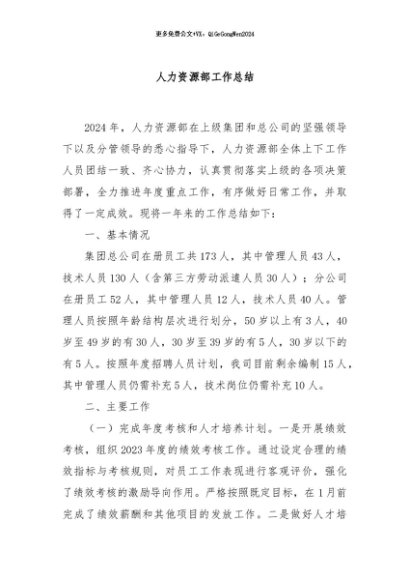 / 【七哥公文】2024年:人力资源部工作总结+更多免费公文+VX:QiGeGongWen2024
