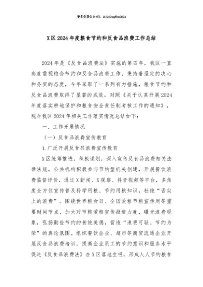 / 【七哥公文】2024年:X区2024年度粮食节约和反食品浪费工作总结+更多免费公文+VX:QiGeGongWen2024