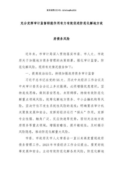 【七哥公文】2024年:充分发挥审计监督职能作用有力有效促进防范化解地方政府债务风险+更多免费公文+VX:QiGeGongWen2024