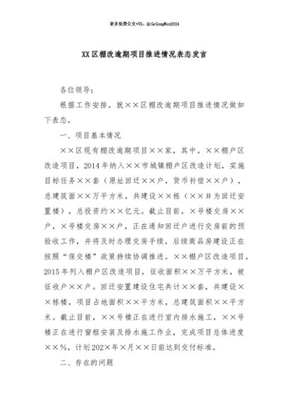 / 【七哥公文】2024年:XX区棚改逾期项目推进情况表态发言+更多免费公文+VX:QiGeGongWen2024