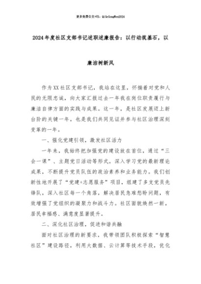 【七哥公文】2024年:2024年度社区支部书记述职述廉报告:以行动筑基石,以廉洁树新风+更多免费公文+VX:QiGeGongWen2024