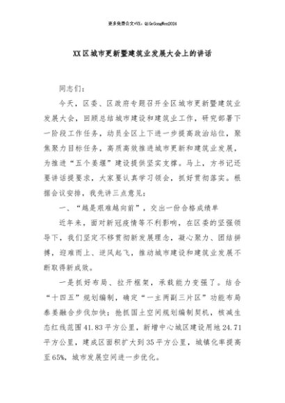 / 【七哥公文】2024年:XX区城市更新暨建筑业发展大会上的讲话+更多免费公文+VX:QiGeGongWen2024
