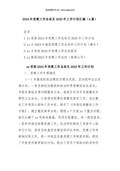 【七哥公文】2024年:(4篇)2024年党建工作总结及2025年工作计划汇编+更多免费公文+VX:QiGeGongWen2024