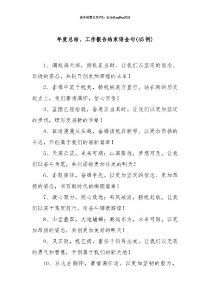【七哥公文】2024年:(45例)年度总结、工作报告结束语金句+更多免费公文+VX:QiGeGongWen2024