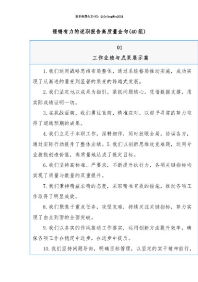 【七哥公文】2024年:(40组)铿锵有力的述职报告高质量金句+更多免费公文+VX:QiGeGongWen2024