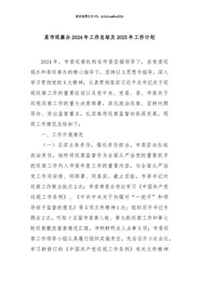 / 【七哥公文】2024年:某市巡察办2024年工作总结及2025年工作计划+更多免费公文+VX:QiGeGongWen2024