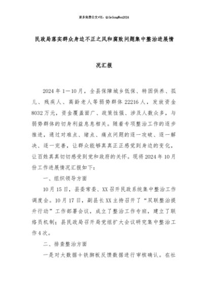 【七哥公文】2024年:民政局落实群众身边不正之风和腐败问题集中整治进展情况汇报+更多免费公文+VX:QiGeGongWen2024