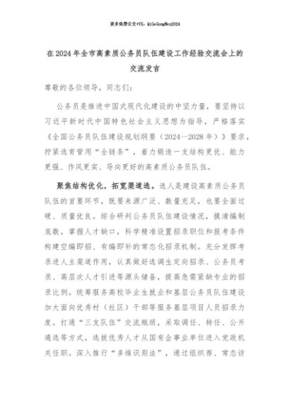 【七哥公文】2024年:在2024年全市高素质公务员队伍建设工作经验交流会上的交流发言+更多免费公文+VX:QiGeGongWen2024