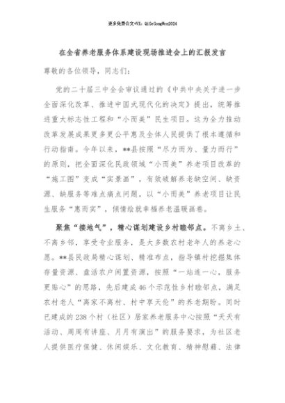 / 【七哥公文】2024年:在全省养老服务体系建设现场推进会上的汇报发言+更多免费公文+VX:QiGeGongWen2024