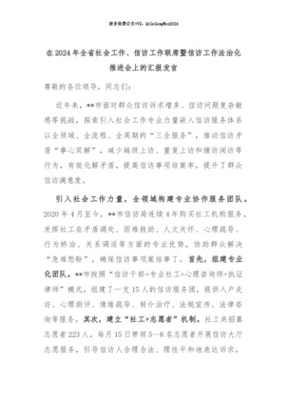 【七哥公文】2024年:在2024年全省社会工作、信访工作联席暨信访工作法治化推进会上的汇报发言+更多免费公文+VX:QiGeGongWen2024