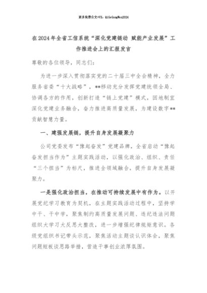 【七哥公文】2024年:在2024年全省工信系统“深化党建链动 赋能产业发展”工作推进会上的汇报发言+更多免费公文+VX:QiGeGongWen2024