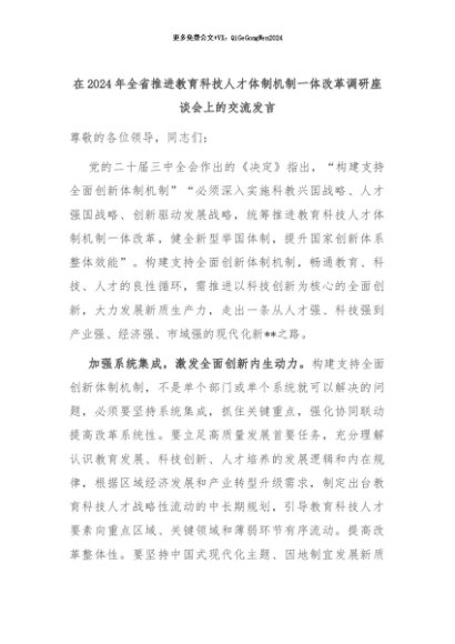 【七哥公文】2024年:在2024年全省推进教育科技人才体制机制一体改革调研座谈会上的交流发言+更多免费公文+VX:QiGeGongWen2024