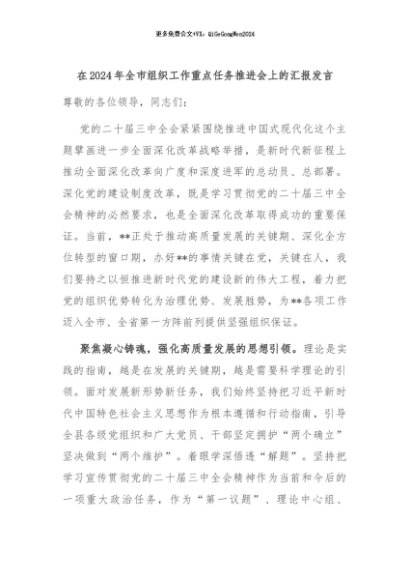 【七哥公文】2024年:在2024年全市组织工作重点任务推进会上的汇报发言+更多免费公文+VX:QiGeGongWen2024