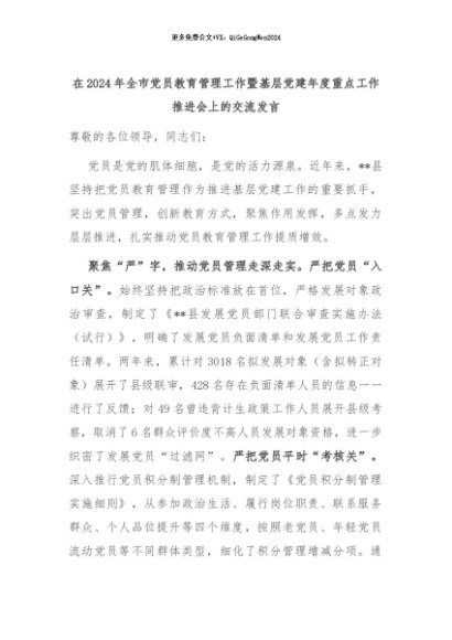 【七哥公文】2024年:在2024年全市党员教育管理工作暨基层党建年度重点工作推进会上的交流发言+更多免费公文+VX:QiGeGongWen2024
