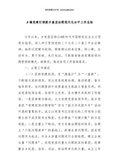 / 【七哥公文】2024年:乡镇党建引领提升基层治理现代化水平工作总结+更多免费公文+VX:QiGeGongWen2024