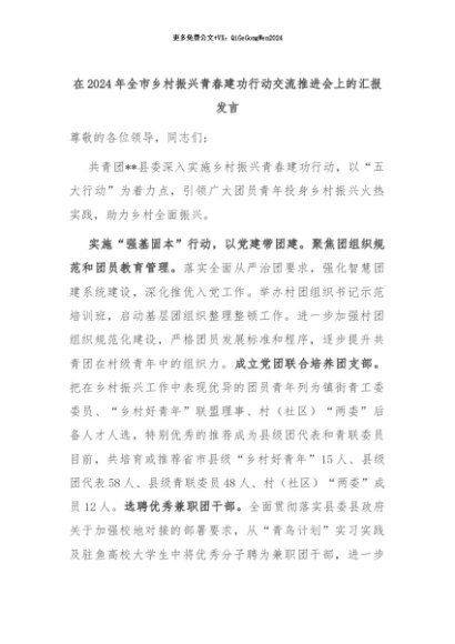 【七哥公文】2024年:在2024年全市乡村振兴青春建功行动交流推进会上的汇报发言+更多免费公文+VX:QiGeGongWen2024